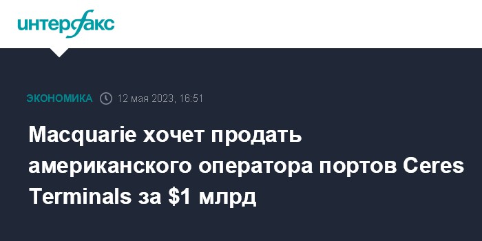 Москва. 12 мая. INTERFAX.RU - Австралийский инвестиционный фонд Macquarie Asset Management собирается продать американского оператора портов и стивидора Ceres Terminals, даже несмотря на сложную ситуацию на рынке инфраструктурных активов, пишет The Wall Street Journal.