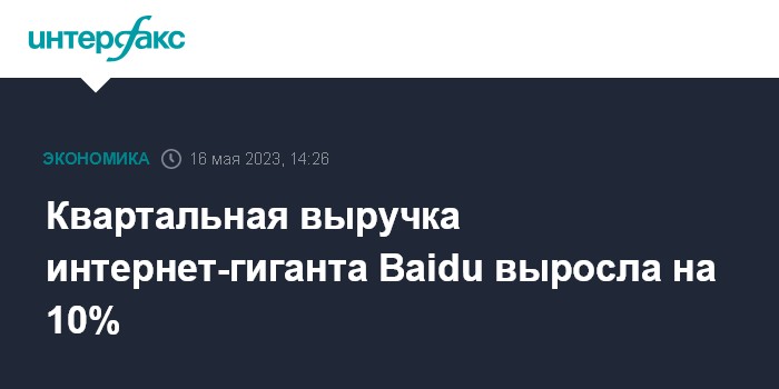 Москва. 16 мая. INTERFAX.RU - В I квартале 2023 года выручка китайского интернет-гиганта Baidu Inc. выросла на 10% и составила 31,14 млрд юаней ($4,54 млрд) против 28,41 млрд юаней годом ранее.
