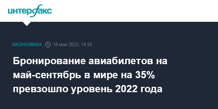Москва. 16 мая. INTERFAX.RU - Бронирование авиабилетов на май-сентябрь, пиковый сезон для летних отпусков в Северном полушарии, на 35% превысило уровень 2022 года, сообщила Международная ассоциация воздушного транспорта (IATA).
