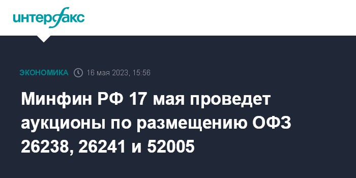 Минфин РФ 17 мая проведет аукционы по размещению ОФЗ 26238, 26241 и 52005
