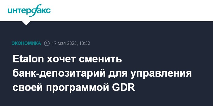 Москва. 17 мая. INTERFAX.RU - Девелопер Etalon Group решил сменить банк-депозитарий, управляющий программой глобальных депозитарных расписок (GDR) компании, сообщила пресс-служба компании.