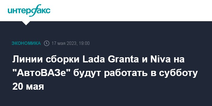 "АвтоВАЗ" 10 мая возобновил производство, приостановленное с 29 апреля по 9 мая включительно в связи с выходными, майскими праздниками и запланированным корпоративным отпуском. Суббота 13 мая была рабочей для линий сборки Lada Granta и Niva.