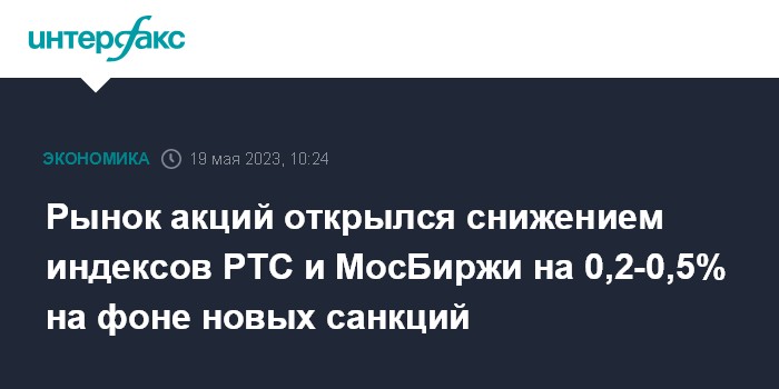 Москва. 19 мая. INTERFAX.RU - Рынок акций РФ на старте торгов в пятницу продолжил снижение по большинству blue chips на фоне объявления утром новых санкций против РФ со стороны Великобритании, в то время как внешние площадки подают позитивные сигналы; индексы РТС и МосБиржи за минуту торгов просели на 0,2-0,5% во главе с бумагами, попавшими в новый санкционный список.