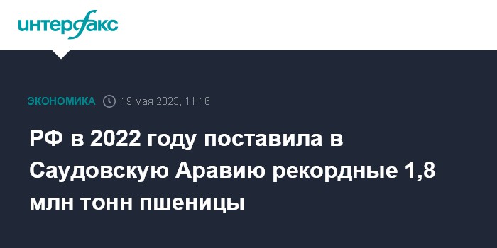 РФ в 2022 году поставила в Саудовскую Аравию рекордные 1,8 млн тонн пшеницы