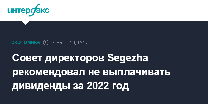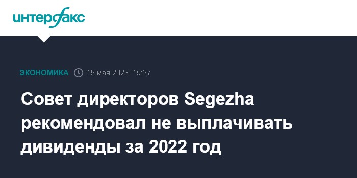 Москва. 19 мая. INTERFAX.RU - Совет директоров Segezha Group (подконтрольный АФК "Система" лесопромышленный холдинг) рекомендовал акционерам на годовом собрании утвердить решение об отказе от выплаты дивидендов по итогам 2022 года, сообщила группа.