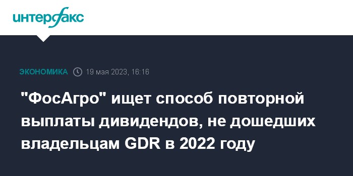 Москва. 19 мая. INTERFAX.RU - Владельцы глобальных депозитарных расписок (GDR) "ФосАгро" не смогли получить дивиденды за 2021 год и I полугодие 2022 года, выплаченные компанией прошлой осенью: денежные средства вернулись депозитарию, следует из отчета "ФосАгро" по МСФО.
