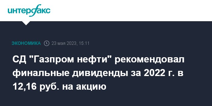 СД "Газпром нефти" рекомендовал финальные дивиденды за 2022 г. в 12,16 руб. на акцию