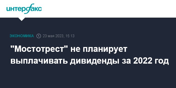 Москва. 23 мая. INTERFAX.RU - Совет директоров ПАО "Мостотрест" рекомендовал акционерам не выплачивать дивиденды за 2022 год, сообщила компания.