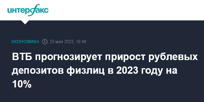 Москва. 23 мая. INTERFAX.RU - ВТБ прогнозирует прирост рублевых депозитов физлиц в 2023 году в целом по рынку на 10%, рассчитывает расти быстрее рынка, сообщил "Интерфаксу" зампред правления банка Анатолий Печатников.