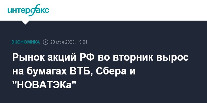 Москва. 23 мая. INTERFAX.RU - Рынок акций РФ во вторник завершил основные торги ростом индексов благодаря вечернему подъему нефти, лидерами роста выступили бумаги ВТБ, Сбербанка и "НОВАТЭКа", в то время как внешние фондовые площадки снизились из-за нерешенности вопроса с повышением потолка госдолга США и "ястребиных" заявлений представителей Федрезерва. Сдерживающим "быков" фактором также выступили просевшие бумаги "Газпрома" на фоне планов концерна не выплачивать финальные дивиденды за 2022 год.