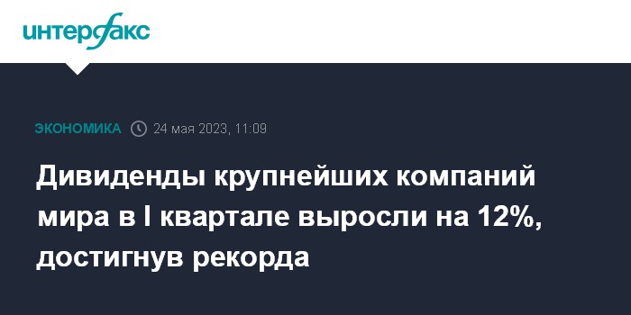 Москва. 24 мая. INTERFAX.RU - Совокупный объем дивидендов, выплаченных крупнейшими компаниями мира, в первом квартале 2023 года вырос на 12% в годовом выражении и достиг рекордной для первого квартала суммы в $326,7 млрд, говорится в исследовании Janus Henderson Investors.