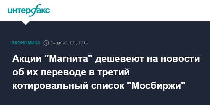 Москва. 24 мая. INTERFAX.RU - Акции ПАО "Магнит" на торгах на "Мосбирже" в среду подешевели на 5,4% (до 4181 рубля за штуку), во вторник они подешевели на 4,6% на новости об их переводе в третий котировальный список "Мосбиржи".