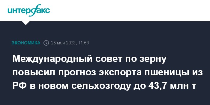 Москва. 25 мая. INTERFAX.RU - Международный совет по зерну (МСЗ) в майском обзоре повысил прогноз экспорта пшеницы из РФ в новом сельхогоду (июль 2023-июнь 2024 гг.) на 1,5 млн тонн, до 43,7 млн тонн.