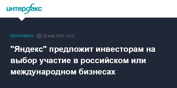 Москва. 25 мая. INTERFAX.RU - Инвесторам группы "Яндекс" предложат на выбор несколько вариантов в рамках разделения бизнеса на российский и международный, включая обмен своих акций в Yandex N.V. на участие в российском бизнесе, сообщает Bloomberg со ссылкой на источники.