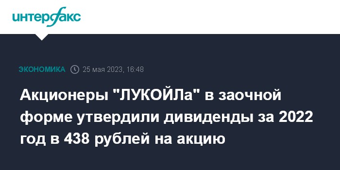 Москва. 25 мая. INTERFAX.RU - Акционеры ПАО "ЛУКОЙЛ" на годовом собрании в четверг в заочной форме утвердили вопрос о выплате дивидендов по итогам 2022 года в размере 438 рублей на одну обыкновенную акцию, сообщает компания.