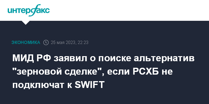 МИД РФ заявил о поиске альтернатив "зерновой сделке", если РСХБ не подключат к SWIFT