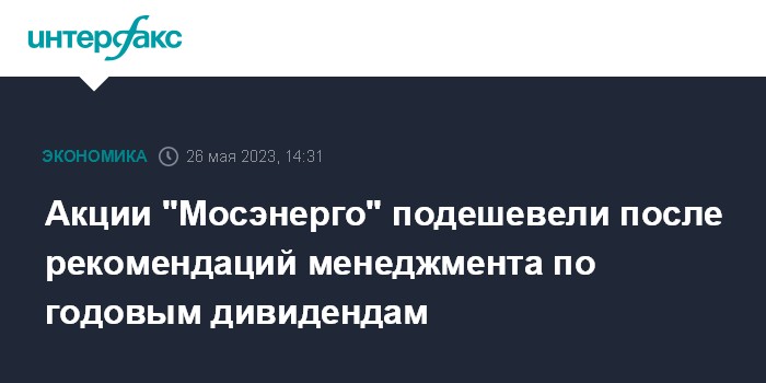 Москва. 26 мая. INTERFAX.RU - Днем в пятницу акции "Мосэнерго" подешевели на новости о рекомендациях совета директоров по дивидендам за 2022 год.