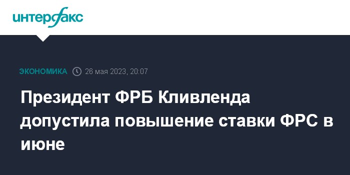 Москва. 26 мая. INTERFAX.RU - Президент Федерального резервного банка Кливленда Лоретта Местер не исключает возможности очередного повышения базовой процентной ставки Федеральной резервной системой в июне в связи с отсутствием ощутимого прогресса в замедлении инфляции.