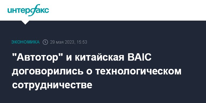 Москва. 29 мая. INTERFAX.RU - "Автотор" и китайская BAIC подписали соглашение о дальнейших планах по стратегическим направлениям развития, сообщила пресс-служба российской компании.
