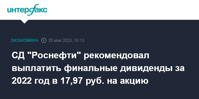 Москва. 30 мая. INTERFAX.RU - Совет директоров "Роснефти" рекомендовал акционерам выплатить дивиденды по результатам 2022 года в размере 17,97 руб. на акцию, сообщила компания.