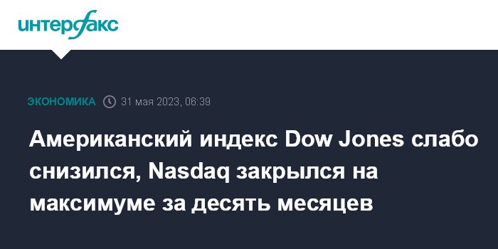 Москва. 31 мая. INTERFAX.RU - Американский рынок акций закрылся без единой динамики во вторник: Dow Jones слабо снизился, Nasdaq умеренно вырос и завершил торги на максимальной отметке за 10 месяцев, тогда как S&P 500 практически не изменился.