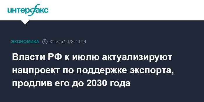 Москва. 31 мая. INTERFAX.RU - Правительство РФ работает над актуализацией и продлением до 2030 года мер поддержки приоритетных экспортных направлений в рамках национального проекта "Международная кооперация и экспорт".