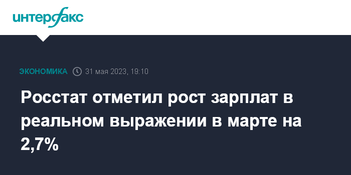 Москва. 31 мая. INTERFAX.RU - В России в марте 2023 года рост реального размера (с поправкой на инфляцию) заработной платы составил 2,7% в годовом выражении после роста на 2% в феврале и на 0,6% в январе, сообщил Росстат.