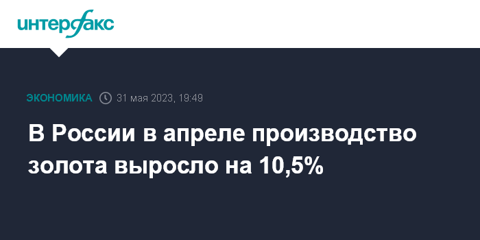 Москва. 31 мая. INTERFAX.RU - Россия в апреле 2023 года увеличила производство золота (необработанного или полуобработанного, или в виде порошка) в годовом измерении на 10,5%, сообщил Росстат.