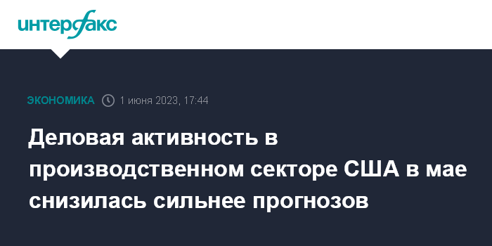 Москва. 1 июня. INTERFAX.RU - В мае 2023 года индекс деловой активности в производственном секторе США (ISM Manufacturing) снизился до 46,9 пункта с 47,1 пункта месяцем ранее, свидетельствуют данные Института управления поставками (ISM).