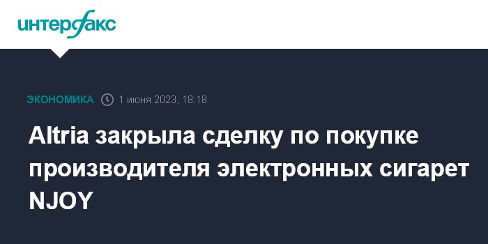 Москва. 1 июня. INTERFAX.RU - Altria Group, одна из крупнейших табачных компаний мира, закрыла сделку по покупке производителя электронных сигарет NJOY Holdings Inc. за $2,75 млрд, говорится в пресс-релизе Altria.