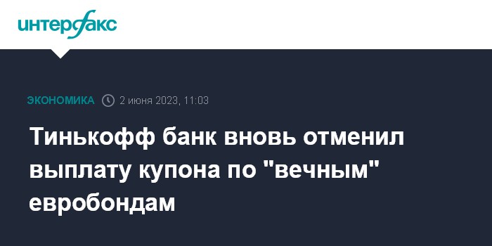 Москва. 2 июня. INTERFAX.RU - Тинькофф банк вновь отменил выплату купона по "вечным" субординированным еврооблигациям – июньский платеж будет пропущен.