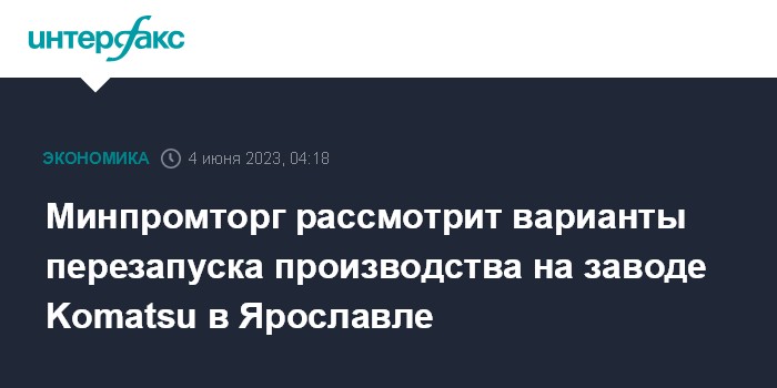 Москва. 4 июня. INTERFAX.RU - Минпромторг РФ, правительство Ярославской области и японский концерн Komatsu прорабатывают возможность перезапуска производства спецтехники на местном предприятии. Ранее администрация региона сообщила о решении ООО "Комацу Мануфэкчуринг Рус" (на 100% принадлежит японскому Komatsu Ltd) полностью остановить выпуск продукции.