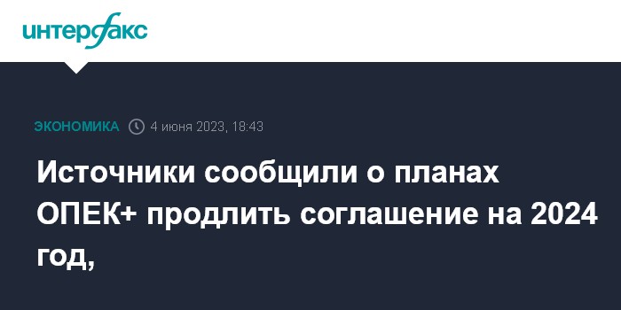 Москва. 4 июня. INTERFAX.RU - Соглашение ОПЕК+ будет продлено на 2024 год, сообщили источники "Интерфакса".