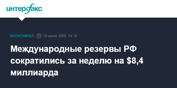Москва. 16 июля. INTERFAX.RU - Международные резервы России на 10 июля составили $400,7 млрд, сообщил в четверг департамент внешних и общественных связей Банка России. Между тем по состоянию на 3 июля международные резервы равнялись $409,1 млрд. Таким образом, за неделю они уменьшились на $8,4 миллиарда.