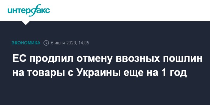 Москва. 5 июня. INTERFAX.RU - Евросоюз продлил еще на год отмену ввозных пошлин на украинский экспорт, это решение вступит в силу с 6 июня 2023 года и будет действовать по 5 июня 2024 года включительно.