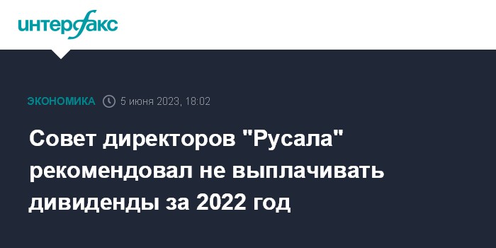 Москва. 5 июня. INTERFAX.RU - Совет директоров "Русала" рекомендовал собранию акционеров компании не распределять прибыль по итогам 2022 года и не выплачивать дивиденды, говорится в сообщении компании.
