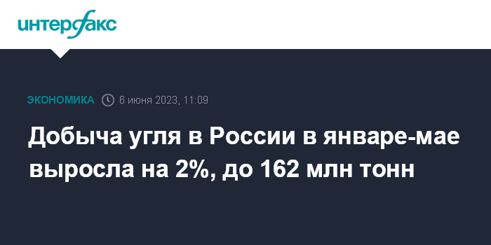 Москва. 6 июня. INTERFAX.RU - Добыча угля в РФ в январе-мае 2023 года выросла чуть более чем на 2% относительно аналогичного периода предыдущего года, до 162 млн тонн, сообщил замминистра энергетики РФ Сергей Мочальников на заседании комиссии по энергетике Госсовета РФ во вторник.