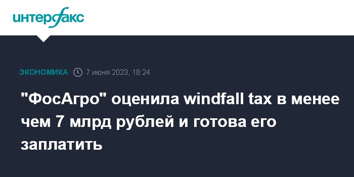 Москва. 7 июня. INTERFAX.RU - "ФосАгро" планирует заплатить windfall tax в конце 2023 года, оценивает налог в сумму менее 7 млрд рублей, заявил замгендиректора по финансам и международным проектам компании Александр Шарабайко в эфире "Финам инвестиций".