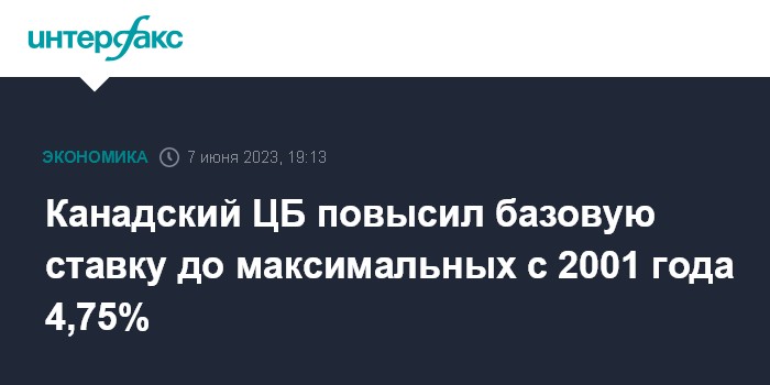 Москва. 7 июня. INTERFAX.RU - Банк Канады неожиданно повысил ключевую процентную ставку на 25 базисных пунктов (б.п.), до максимальных с 2001 года 4,75% годовых.