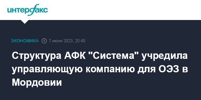 Москва. 7 июня. INTERFAX.RU - ООО "Система Телеком Активы" (входит в АФК "Система") зарегистрировало дочернее ООО "Управляющая компания особой экономической зоны "Мордовия" (УК ОЭЗ "Мордовия"), следует из данных ЕГРЮЛ.