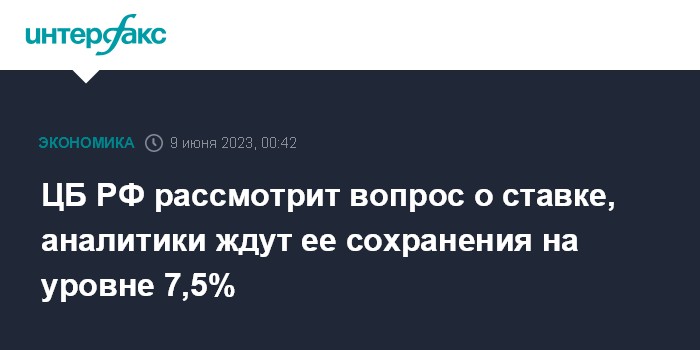 Москва. 9 июня. INTERFAX.RU - Совет директоров Банка России рассмотрит вопрос об уровне ключевой ставки, аналитики ждут ее сохранения в размере 7,5%.