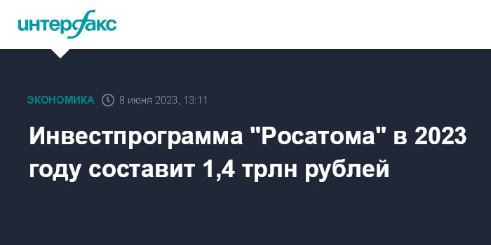 Москва. 9 июня. INTERFAX.RU - Инвестпрограмма ГК "Росатом" в 2023 году составит 1,4 трлн рублей, в 2024 году вырастет до 1,8 трлн рублей. Об этом сообщило официальное издание госкорпорации "Страна Росатом" со ссылкой на директора по капитальным вложениям, государственному строительному надзору и государственной экспертизе "Росатома" Геннадия Сахарова.