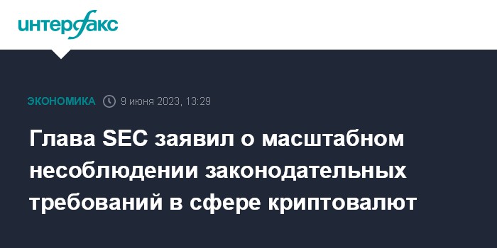 Москва. 9 июня. INTERFAX.RU - Глава Комиссии по ценным бумагам и биржам (SEC) Гэри Генслер довольно резко высказался в отношении рынка криптовалютных активов, отметив, что несоблюдение законодательных требований в отрасли может нанести ущерб доверию к американским финансовым рынкам.