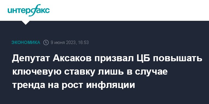 Депутат Аксаков призвал ЦБ повышать ключевую ставку лишь в случае тренда на рост инфляции
