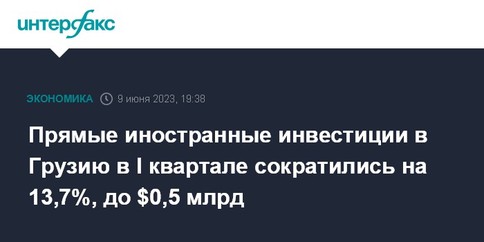 Москва. 9 июня. INTERFAX.RU - Объем прямых иностранных инвестиций (ПИИ) в Грузию в I квартале 2023 года составил $496,6 млн, это на 13,7% меньше, чем за аналогичный период прошлого года, но на 53,3% превышает показатель IV квартала 2022 года, сообщила Национальная служба статистики (Грузстат).