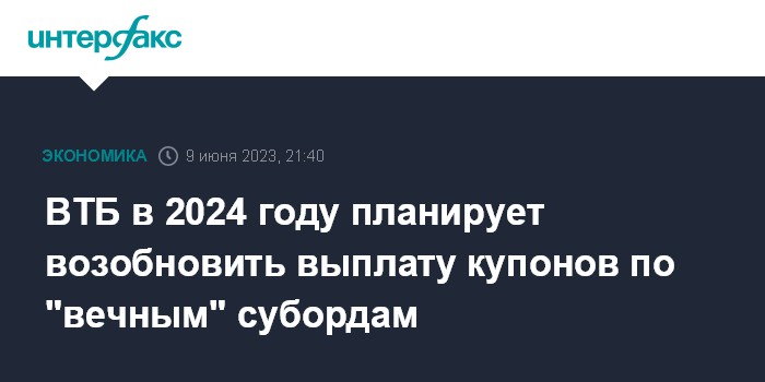 Москва. 9 июня. INTERFAX.RU - ВТБ, временно приостановивший выплату купонов по ряду выпусков "вечных" субординированных облигаций, планирует возобновить платежи, если получит согласие Банка России.