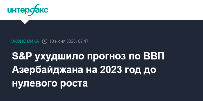 Москва. 13 июня. INTERFAX.RU - Международное рейтинговое агентство S&P Global Ratings прогнозирует нулевой рост ВВП Азербайджана в 2023 году, среднегодовые темпы экономического роста в 2024-2026 годах на уровне 1,4%, говорится в материалах агентства.