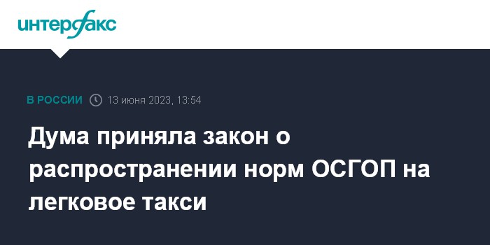 Москва. 13 июня. INTERFAX.RU - Госдума приняла во втором и третьем чтении закон, который распространяет норму об обязательном страховании гражданской ответственности перевозчиков (ОСГОП) на легковые такси, закон вступит в силу 1 сентября 2024 года, если его одобрят сенаторы и подпишет президент.