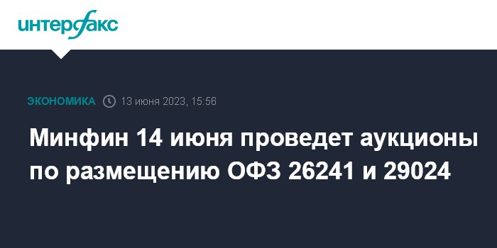 Минфин 14 июня проведет аукционы по размещению ОФЗ 26241 и 29024