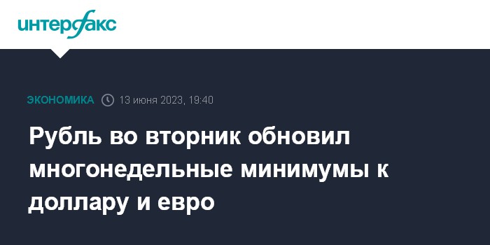 Как отмечают эксперты "Интерфакс-ЦЭА", рубль сильно упал к доллару и евро, обновил в ходе торгов многонедельные минимумы в обеих парах. В первой половине дня давление на рубль оказали цены на нефть, упавшие в пределах 4% по итогам понедельника. В этот день Московская биржа не работала из-за праздничного выходного дня по случаю Дня России. Позднее рубль ускорил снижение на фоне спроса на валюту со стороны импортеров под международные переводы.